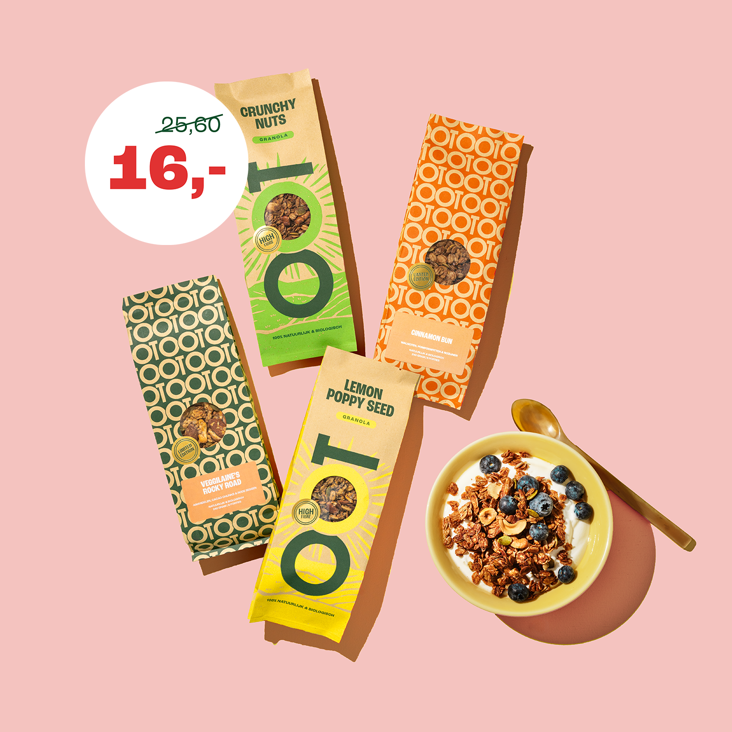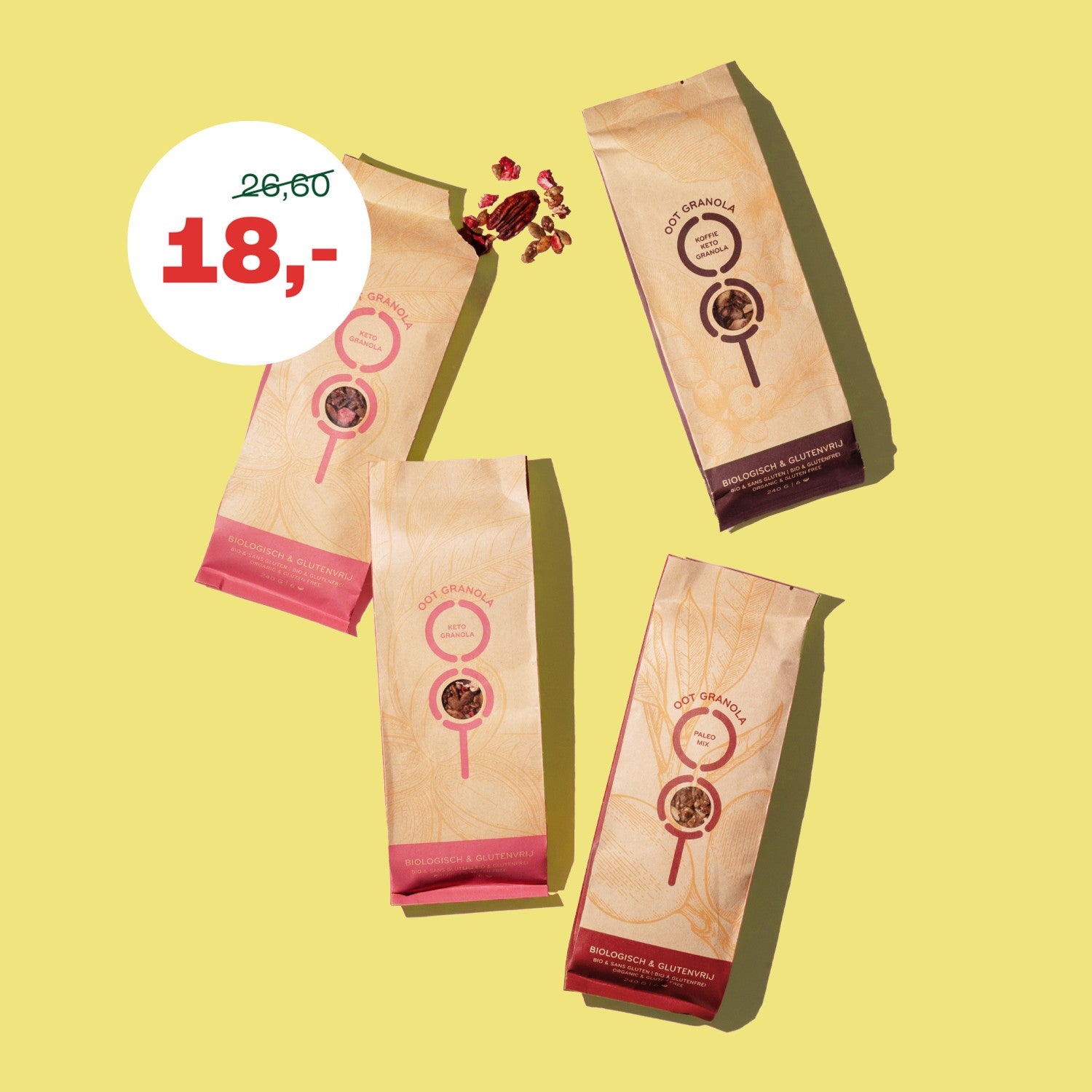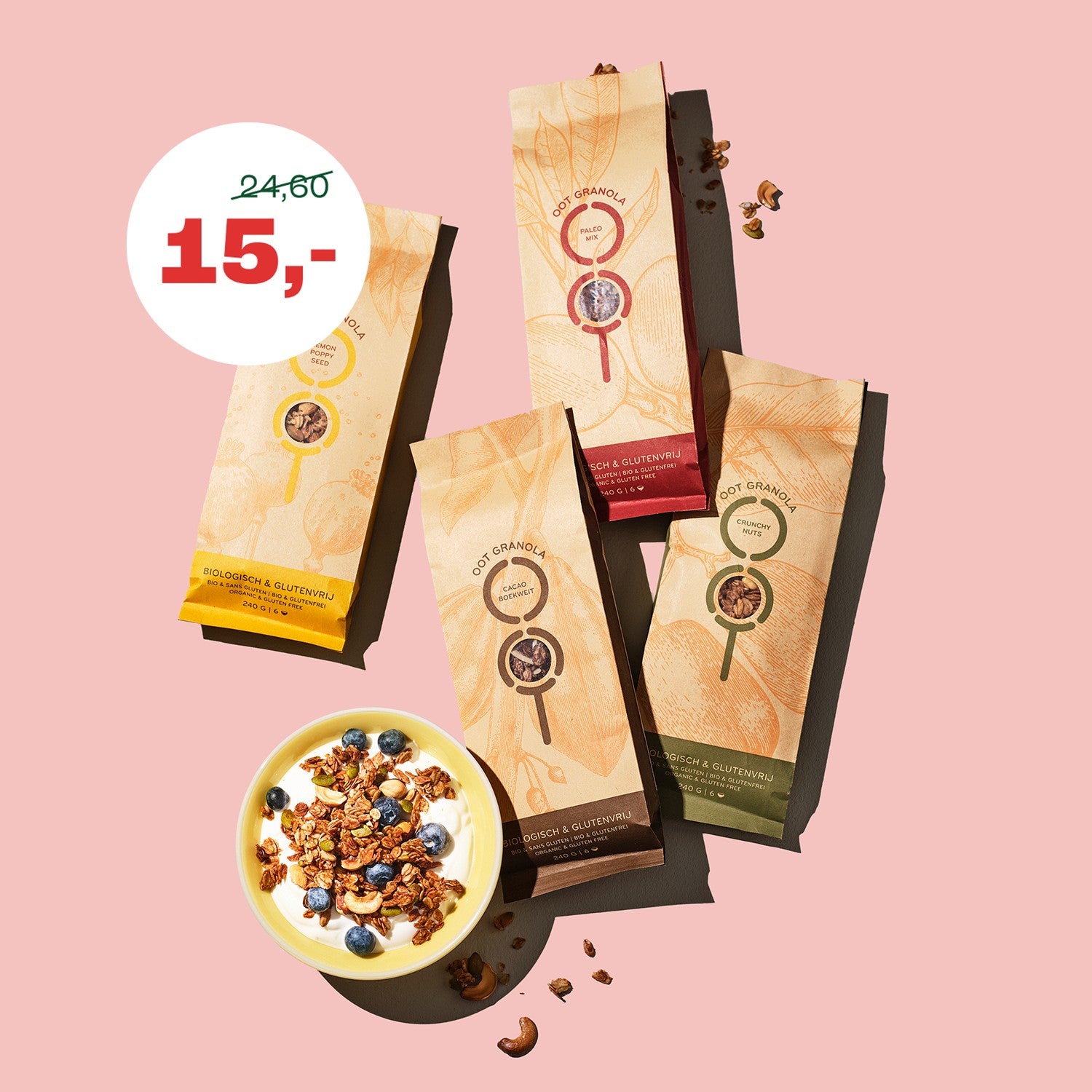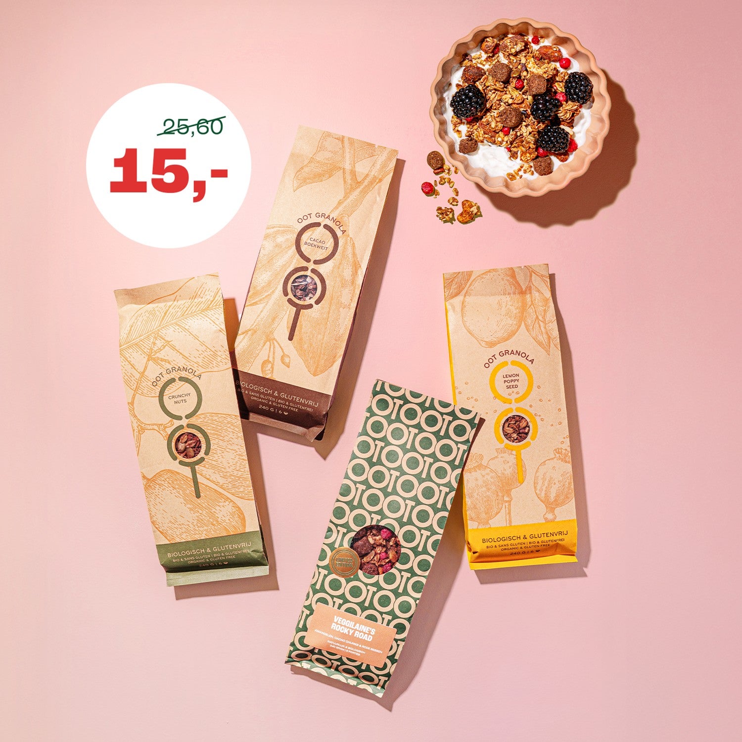 Ja. We bakken onze granola elke dag vers, en deze wordt dan gelijk in luchtdichte zakken verpakt. We zorgen ervoor dat jouw granola altijd minstens 6 weken houdbaar is. Stop hem thuis in je Oot bewaarpot en je kunt hem koel en donker in je keukenkastje bewaren, dan blijft hij lang lekker en goed.