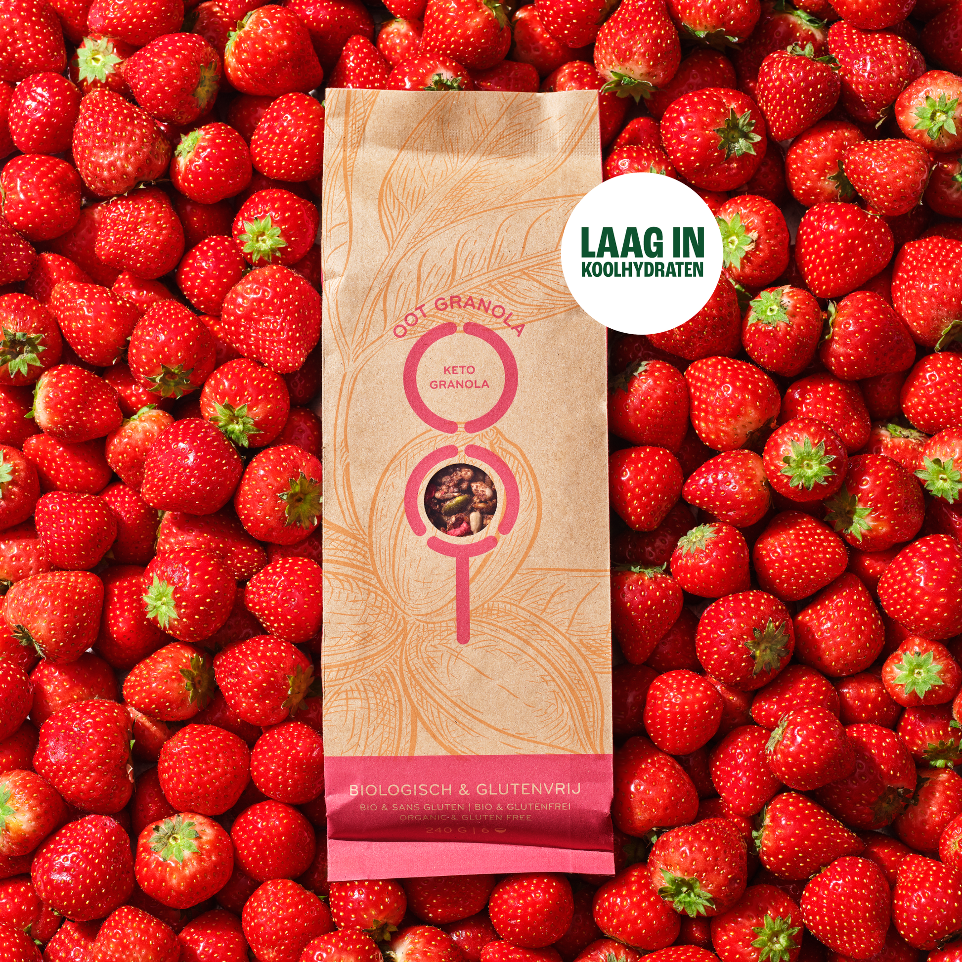 Een suikerarme granola met minder dan 4 gram koolhydraten per (flinke) portie. We roosteren de noten, pitten, zaden en kruiden met amandelpasta van de beste kwaliteit, en voegen daarna gevriesdroogde aardbeien toe voor een frisse bite.
